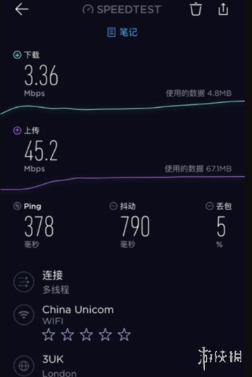 4、测试结果主要为3项:Ping 值,下载速度和上传速度。