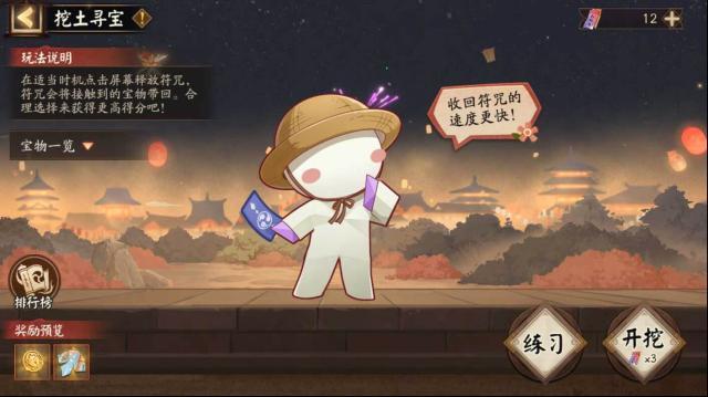 需要控制小纸人,在适当时机释放符咒,挖掘埋于地下的各种宝物。伴着不同式神祝福努力开挖,消耗夏日游园券参与挖土,还可以获得游园币、被遗忘的绘本等奖励哦~