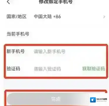 4、输入新的手机号并获得验证码,最后点击最下方的完成即可。