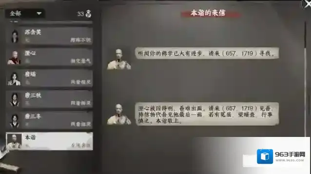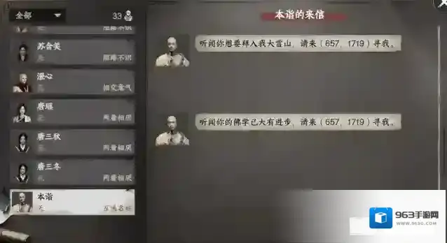完成江湖故事好学游僧后收到本诣飞鸽后来到657.1719交谈本诣加入大雪山后加入