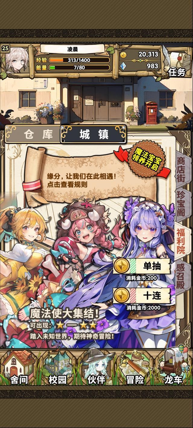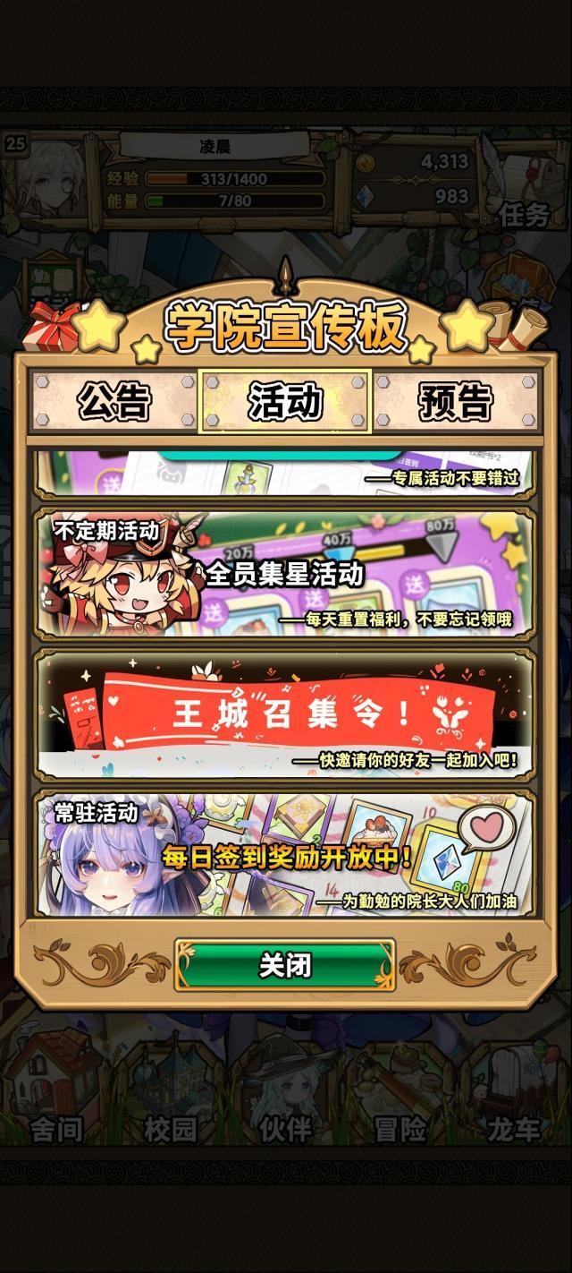在通关第二章之后基本上就陆续解锁其他各种挂机得资源的模式了魔法学院,星光集市,魔法之森以及巡逻,前仨个模式前期基本上升个一级左右就够了,因为金币紧缺,这几个模式都是随便拿几个角色放上去挂着就行不用怎么管
