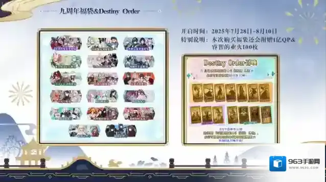 围绕9周年庆典,本次前哨直播《FGO》公布了令人心动的活动福利。首先是一年一度的周年福袋,今年的九周年福袋除了包含许多高强度从者外,还会附赠1亿QP与睿智的业火100枚。而限时Destiny Order召唤则可在自己选择的9骑★5(SSR)从者中必定获得1骑。即日起,《FGO》还上线9周年特惠圣晶石礼包(限购一次),内含付费圣晶石与免费圣晶石共计200,各位御主千万不要错过哦!