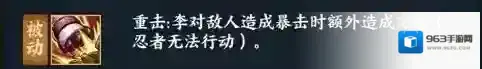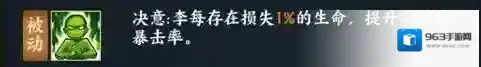 被动:这个被动效果可以把损失生命转化为暴击率,也就是说损失的生命越多,暴击率也就越高,最高暴击率应该可以达到30%-39%左右。总的来说,这是一个爆发型被动,配合上一个被动,会让敌人极为痛苦。