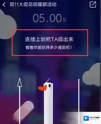 4,这个游戏的游戏规则就是用力把这个戴着帽子的小鹅给提出来,成功的话就能获得一定的花呗额度,当然这个有几率,也会有不成功的时候哦,共有10次提额机会,每轮有5秒的时间。