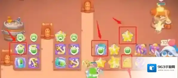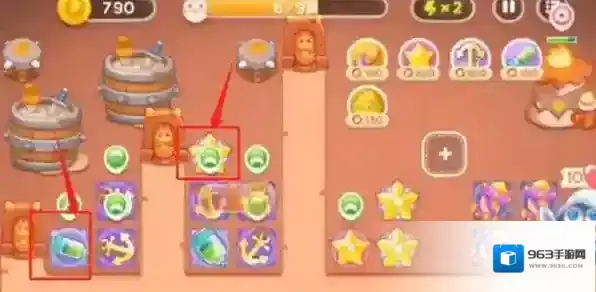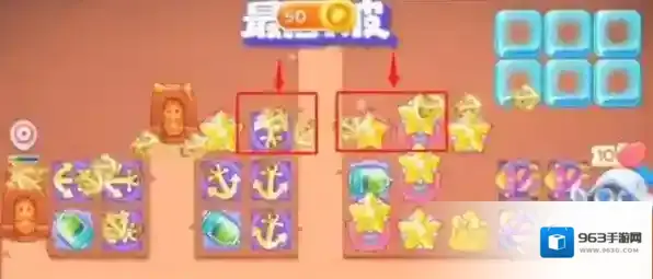 8、第八波道具全清,右侧加一星星塔,把场上一些道具升级,左侧加一船锚,右侧加一星星塔。