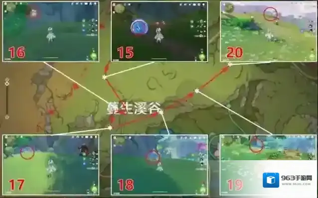 1、蔓生溪谷地图区域中礼券的分布图如下图所示,有20个礼券点位。
