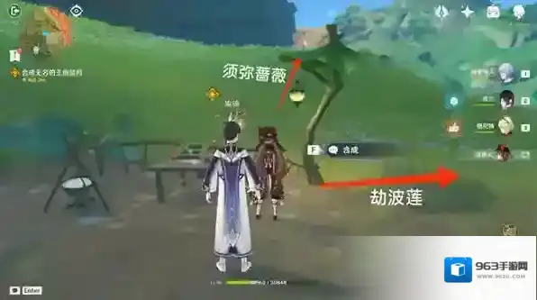 对话后在旁边的合成台合成无名的王庭禁药,材料:异种蘑菇两朵(对话中获得),须弥蔷薇一朵(没有的话可以到对话点东南面的草地上得到一朵,另外一朵在之后采摘异种蘑菇后往前走得到),劫波莲一朵(没有的话,可以到对话点西南面不远的岩石上得到两朵)