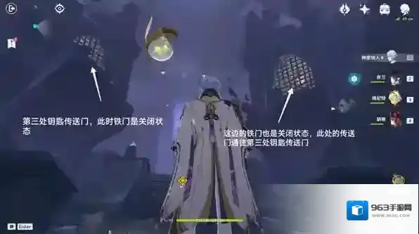 往后走穿过传送门到达第一处钥匙处,往右边楼梯走,此时铁门打开,穿过右边的传送门(旁边有一个精致的宝箱)