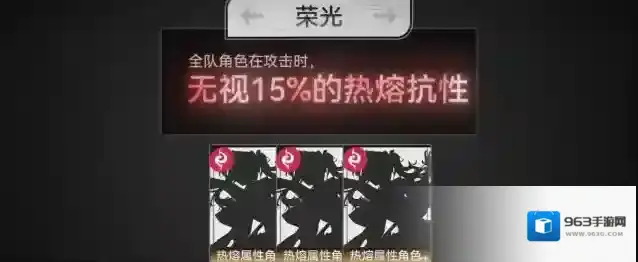 荣光可以让全队角色在攻击时,无视3%的热熔抗性,如果队伍携带3名热熔角色,那么就会来到15%