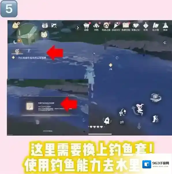 5.这里需换上钓鱼套,使用钓鱼能力去水里钓鱼。