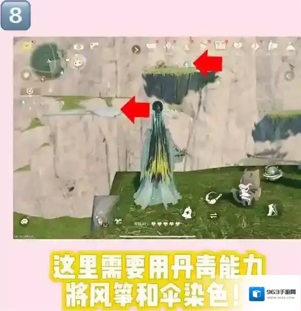 3.用能力套装将荷叶“变真实”,跳上后需快速染下一个,否则荷叶消失会落水。有鱼套可直接用“鱼游能力”在水上行走。