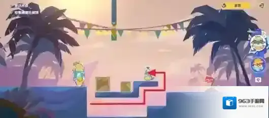 大箱子被推到挡板前,小矮个会掉到下层。操作小矮子往右走,按照下图红色箭头路线到达平台上方小箱子所在位置,把小箱子推到机关上,挪开挡板。