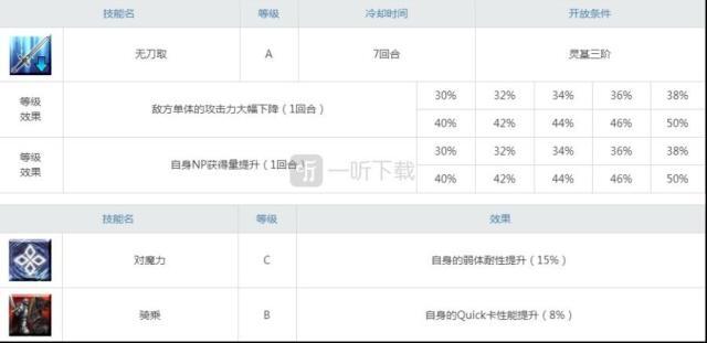 最后是3技能,单从效果来看也是很出色了,一回合的大幅度降攻配合宝具和队友的加防技能,可以直接让敌人的宝具伤害降到零,同时绑定1技能与宝具来使用的话,一回合高额的黄金律让柳生宝蓝蓝暴击可以直接达成宝具连发,升级优先度仅次于1技能。