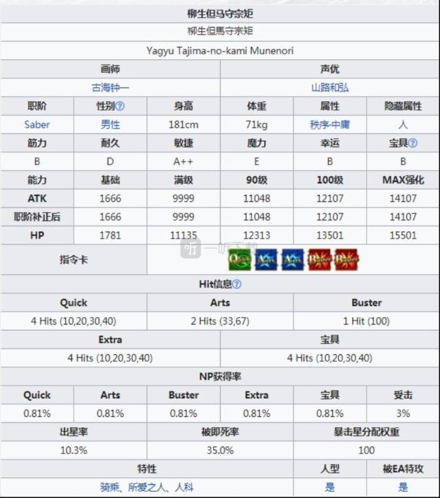 从面板来看,柳生的攻击力白值在四星剑阶从者中算是非常的优秀了,排名第四,保证了输出不会被白值拖累,同时因为不错的蓝绿卡hit比,柳生的绿卡性能非常出色,有4hit,不论是np还是暴击星获取都是不错,但是因为配卡只有一张绿卡,所以也是很难发挥绿卡的优势。但是柳生的蓝卡就比较一般了,可以说柳生的总体np水平只属于平均水平。