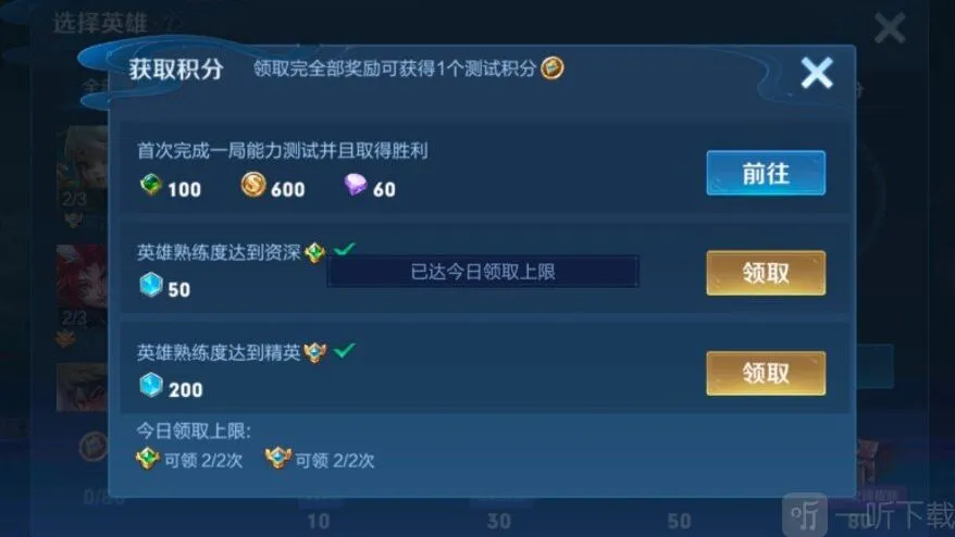 每天选择两位高熟练度的英雄去通关能力测试,领取奖励后总共能拿到2个测试积分。