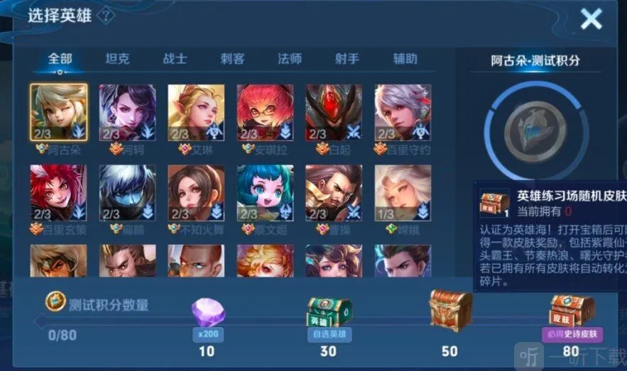 而皮肤宝箱需要80个测试积分,意味着你需要完成80位英雄的任务才能拿到皮肤宝箱。