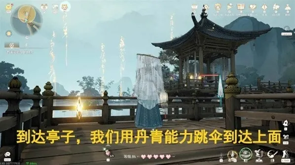 按指引到目标地点,用丹青能力借伞跳到屋顶拿画卷。