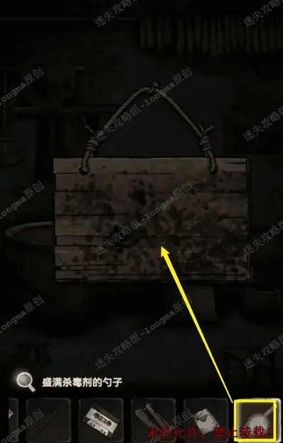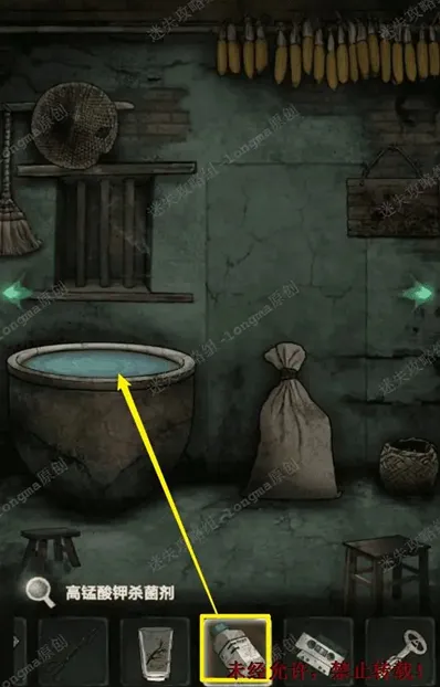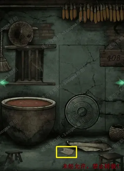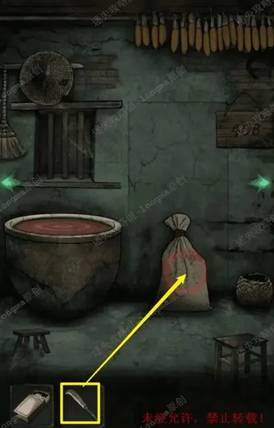 72.来到水缸场景,使用柴刀打开墙边的麻袋,出现暗室机关,查看地上纸条上的线索。