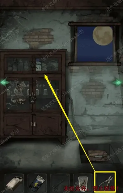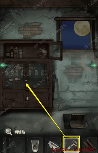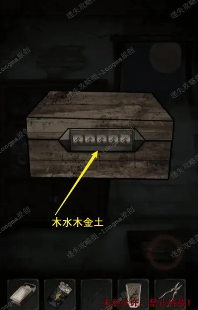 59.向左来到玻璃柜处,使用辣椒粉驱赶窗户上的虫子,月光照进来后,打开地上的暗格,根据第二章小索日记本中的线索:木水木金土,打开里面的箱子,得到磁带。