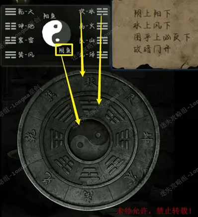 73.根据纸条上的线索,对照锅炉房的图案,打开暗室机关(阴鱼在上面,对应水的图案和卦文在上面,如图73),第四章结束。