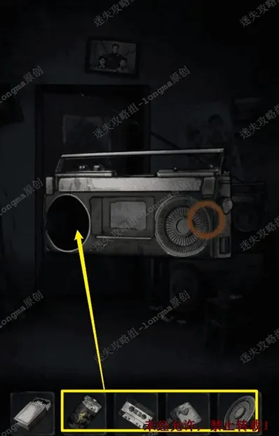 70.走出铁门房间,在收音机处,将电池磁带播放按钮收音机喇叭安装上去,打开收音机,得到线索橱窗密码:虎猪龙。