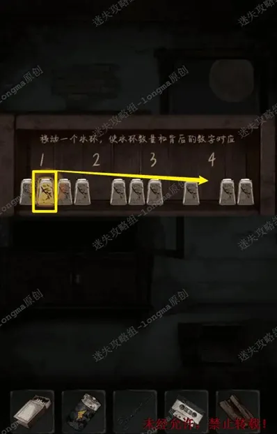 63.回到玻璃柜处,使用铜钥匙打开中间柜门,将杯子放进去,完成谜题(将第二个杯子放在最后一个空挡处),得到水瓢和播放按钮。