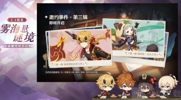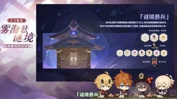 除了全新的岛屿之外,2.2版本也将更新「谜境悬兵」、「古时孤影」、「镜花听世」、「梦里生花」等活动。在版本活动「谜境悬兵」中,旅行者将配置出阵队伍和后援队伍,来应对暗藏魔物、危机四伏的「诀箓阴阳寮」。通过参与活动得到活动货币,可以邀请角色「燥热旋律·辛焱(火)」,并兑换包括天赋培养素材「智识之冕」在内的各类奖励。