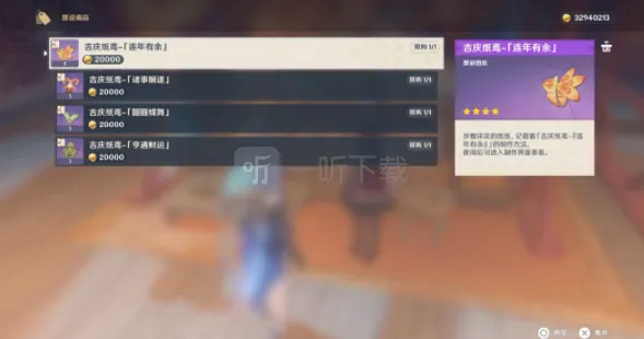 4、玩家在这里和枕鸢对话就可以购买,店里有4个风筝图纸,每个2万摩拉。分别是——『吉庆纸鸢-「连年有余」』+『吉庆纸鸢-「诸事顺遂」』+『吉庆纸鸢-「翾翾蝶舞」』+『吉庆纸鸢-「亨通财运」』。