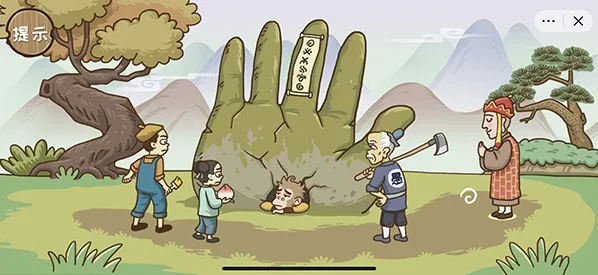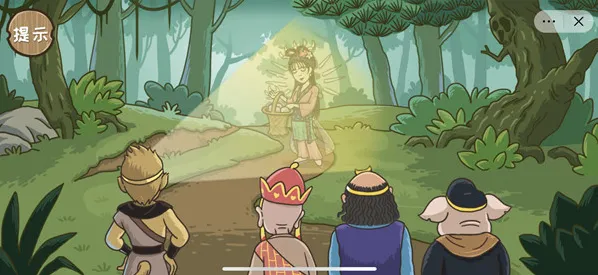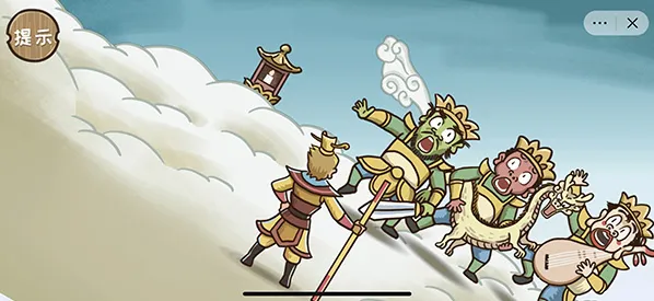通关技巧:首先点击左上角的树枝会出现一只蝉,然后将左边第一个人手中的油漆拖动到蝉的身上变成金蝉,最后将金蝉拖动到右边和尚的头上即可召唤唐僧,解救成功。