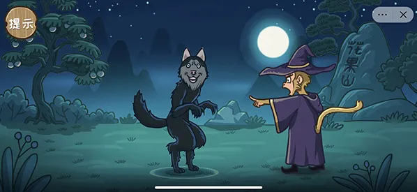 通关技巧:首选点击太阳变成黑夜,然后点击二郎神的眼睛,二郎神变成狼,最后点击猴子的眼睛变成预言家即可完成通关。