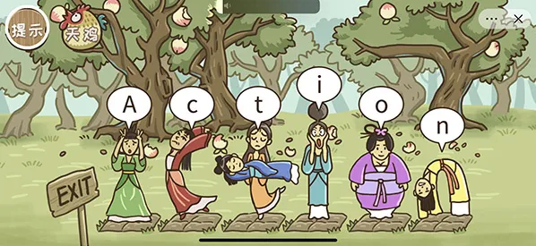 通关技巧:如图所示,按住顺序将七个仙女拉动到方块上,组成Action英文即可通关。