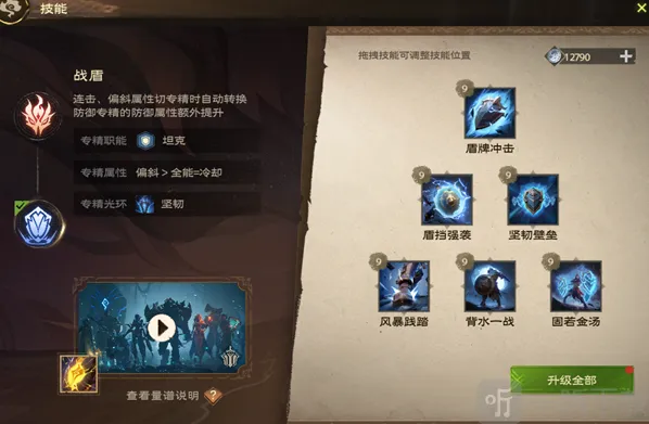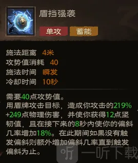 效果:使用盾牌猛力攻击目标,造成你攻击力的160%+180点物理伤害,提升自身物防36点,持续6秒,并使你获得9点坚韧值。
