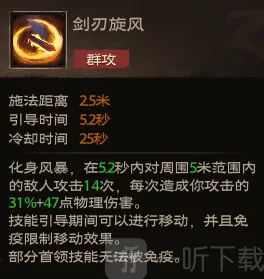 效果:化身风暴,在5.2秒内对周围5米范围内的敌人攻击14次,每次造成你攻击的31%+47点物理伤害。技能引导期间可以进行移动,并且免疫限制移动效果。部分首领技能无法被免疫。