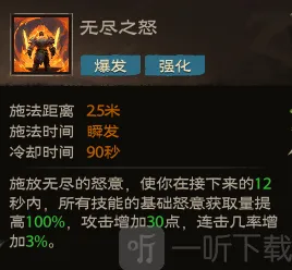 效果:施放无尽的怒意,使你在接下来的12秒内,所有技能的基础怒意获取量提高100%,攻击增加30点,连击几率增加3%。