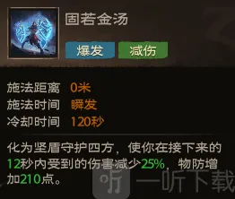 效果:化为坚盾守护四方,使你在接下来的12秒内受到的伤害减少25%,物防增加210点。