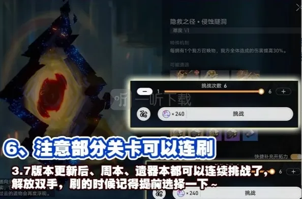 6、3.7版本更新后,周本、遗器本、晋阶材料本、饰品提取都可以连刷了,且增加了连刷次数,最多消耗240体力(材料本可以连刷24次了!),在刷的时候注意提前设置好,夸夸解放双手的好优化!