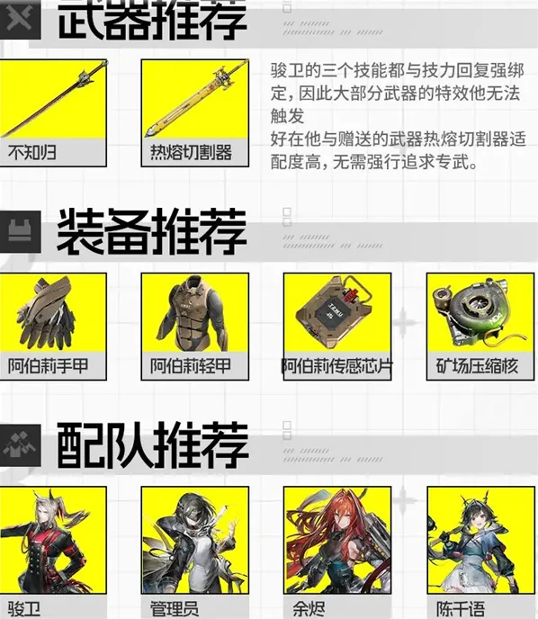 1、武器方面骏卫的三个技能都与技力回复强绑定,因此大部分武器的特效他无法触发,好在他与赠送的武器热熔切割器适配度高,无需强行追求专武。