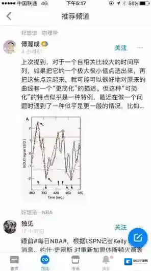“推荐频道”分了物理学、NBA、电影、美食等诸多子频道,应该是大点的话题都有。频道中的用户可以一键关注,但每个频道下面只有一个推荐用户,没有选择的余地这点比较遗憾。