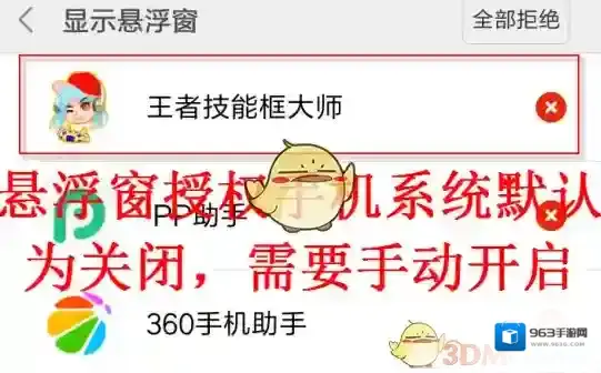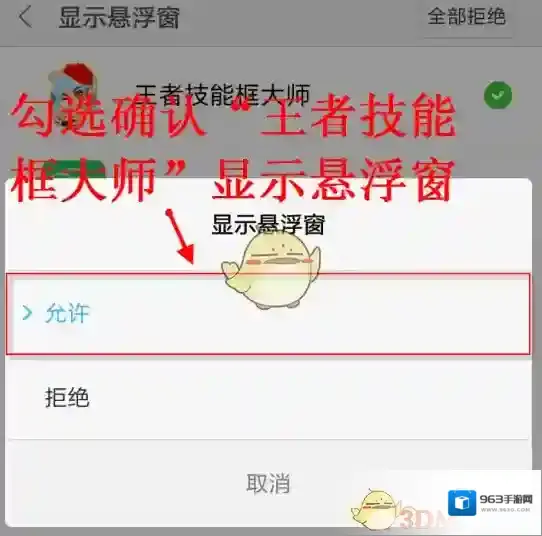 6、给“王者技能框大师”勾选允许确认,就完成悬浮窗的授权了。