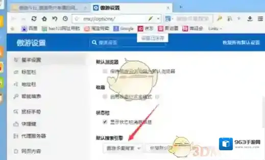六、在基本设置选项卡的右侧窗口,找到“默认搜索引擎”下的“选择默认搜索引擎”选项,并选择需要设置为默认的搜索引擎即可。如图所示;