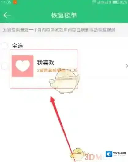 7、在恢复歌单页面,我们点击”我喜欢“便可看到删除的全部歌曲;选择并点击”恢复“即可。