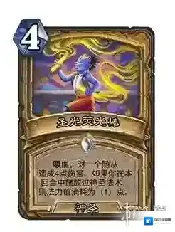 新:吸血。对一个随从造成4点伤害。如果你在本回合中施放过神圣法术,则法力值消耗为(1)点。