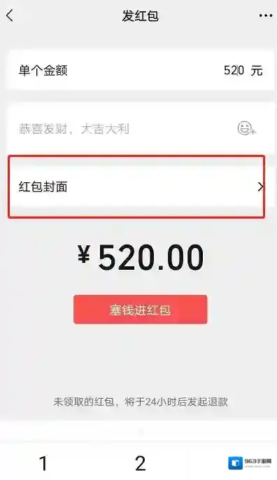 2、在此输入红包金额,如果有红包封面的用户还能点击框中位置设置一个专属红包封面哦~输好金额后点击塞钱进红包。