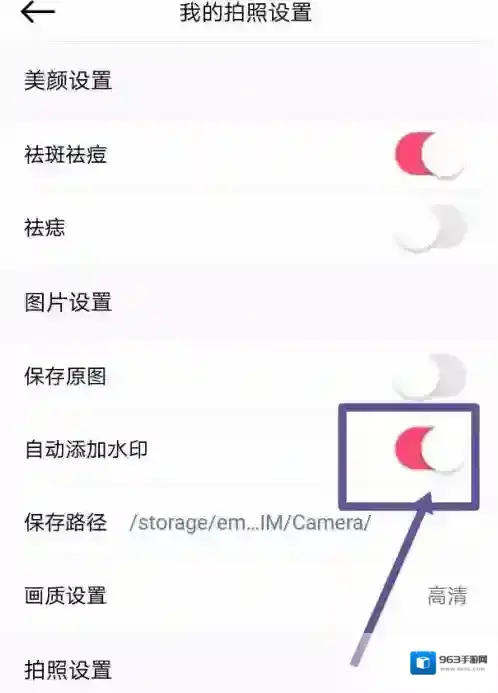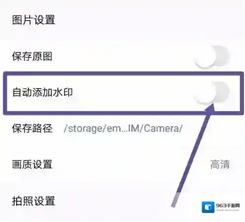4、然后我们就能看“自动添加水印”,需要说明一点是,水印都是相机自带,不可自己重新设置。