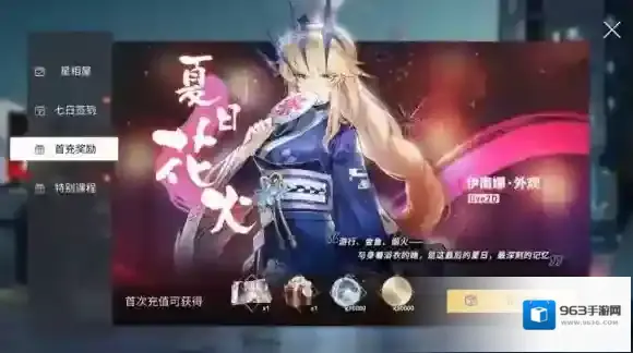 首次充值任意金额,即可获得伊南娜Live2D浴衣外观夏日花火(皮肤)。