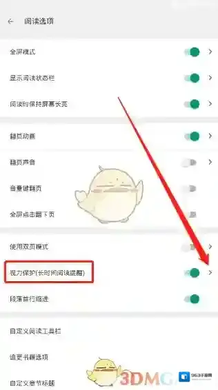 5、这时候我们就来到了“阅读选项”的功能中,在这里找到“视力保护(长时间阅读提醒)”的功能并点击后方的滑动关闭。