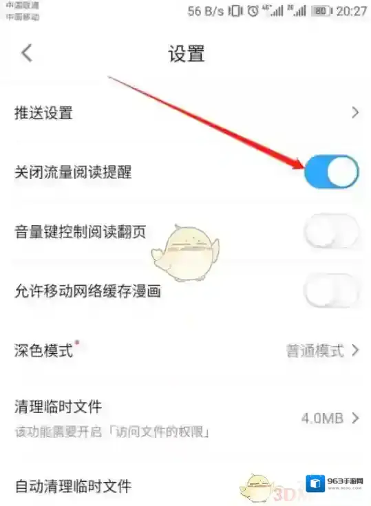 3、“设置”页面根据指引点击“关闭流量阅读提醒”开关标识。如图所示: