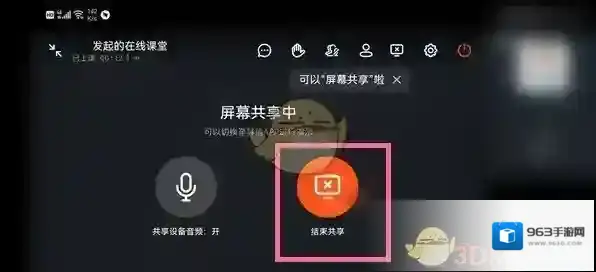 打开钉钉,在群聊天界面点击视频会议,选择课堂模式,发起共享后,点击结束共享即可。
