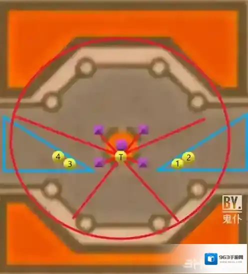 关于BOSS的站位推荐如下:T和他的四名队友,紫圆为BOSS,四个立体方形是水晶(史诗级的固定刷新位置),红色直线为水晶攻击弹道,蓝色为安全区域,可以有效避开大叔3个攻击技能的伤害,当然,输出还是得清水晶的,另外,红色圆为大叔的大招范围,圆形以外安全。