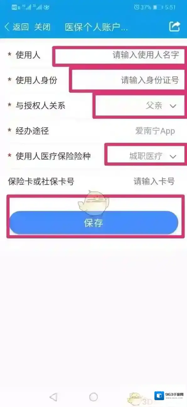 登录“爱南宁”APP选择“智慧医保” 点击医疗待遇 点击“职工医保个人账户授权办理” 点击“添加授权人” 输入使用人姓名、身份证号、选择与授权人的关系、选择使用人的医疗保险险种后点击“保存”即可。